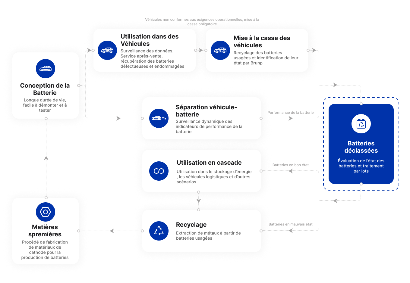 Soutenu par sa filiale Brunp, CATL travaille main dans la main avec ses clients pour créer une boucle fermée de production de batteries - application - utilisation en cascade - recyclage. Dans le même temps, CATL est en pourparlers avec des partenaires locaux en Europe pour une coopération stratégique dans les domaines des matériaux actifs de cathode et du recyclage des batteries, afin de promouvoir la localisation de CATL en Europe et de développer une chaîne de valeur durable pour les batteries, contribuant ainsi à la réalisation des objectifs de neutralité carbone au niveau mondial.